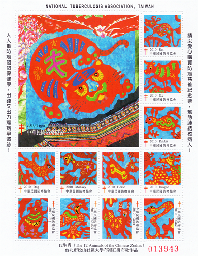 台北市松山社區大學布裡紅拼布社精心創作,以“寅虎”為主軸十二生肖圖之作品為版面。