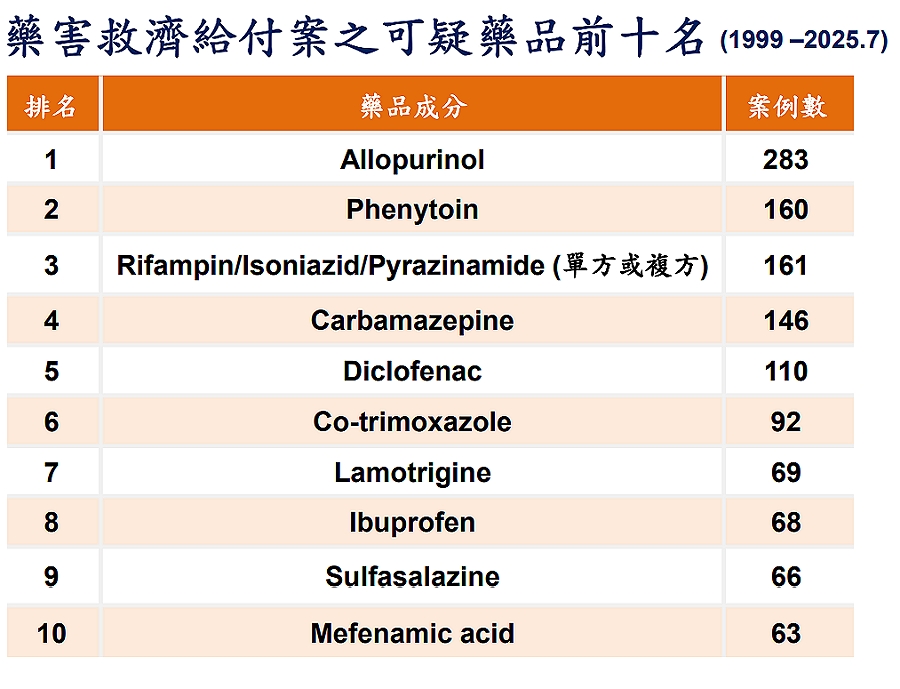 藥害救濟給付案之可疑藥品前十名 (1999 –2025.7) 中,Rifampin / Isoniazid / Pyrazinamide (單方或複方) 排名第3
