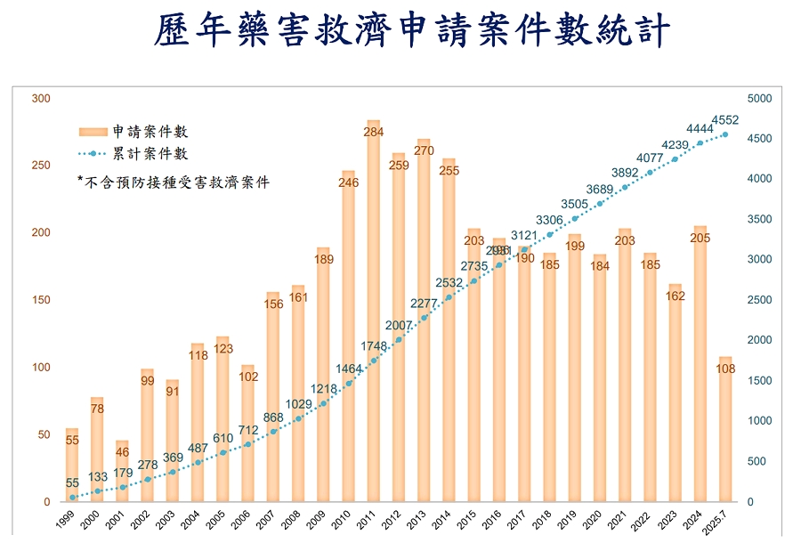 今年迄今(7月)藥害救濟申請案件數有108件,歷年累計4552件(以上不含預防接種)